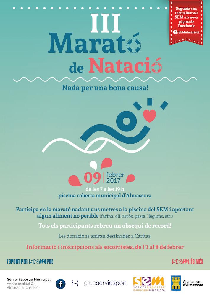 La piscina coberta d'Almassora es prepara per a celebrar la III Marató de Natació, una prova que tindrà caràcter solidari. Per a participar, els nadadors hauran d'aportar aliments no peribles que, en finalitzar la jornada, seran lliurats a la delegació local de Càrites. Amb una durada de 12 hores, de 7.00 a 19.00, la competició tindrà lloc dijous que ve 9 de febrer, quan un dels carrils de la piscina romandrà reservat per a aquells nadadors que vulguen sumar-se a la iniciativa. La participació està oberta tant a abonats del Servei Esportiu Municipal (SEM) com a la resta de veïns, els qui hauran d'apuntar-se abans del dimecres 8.