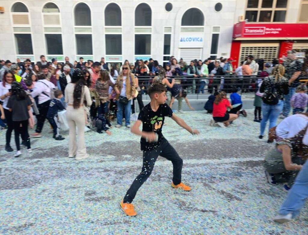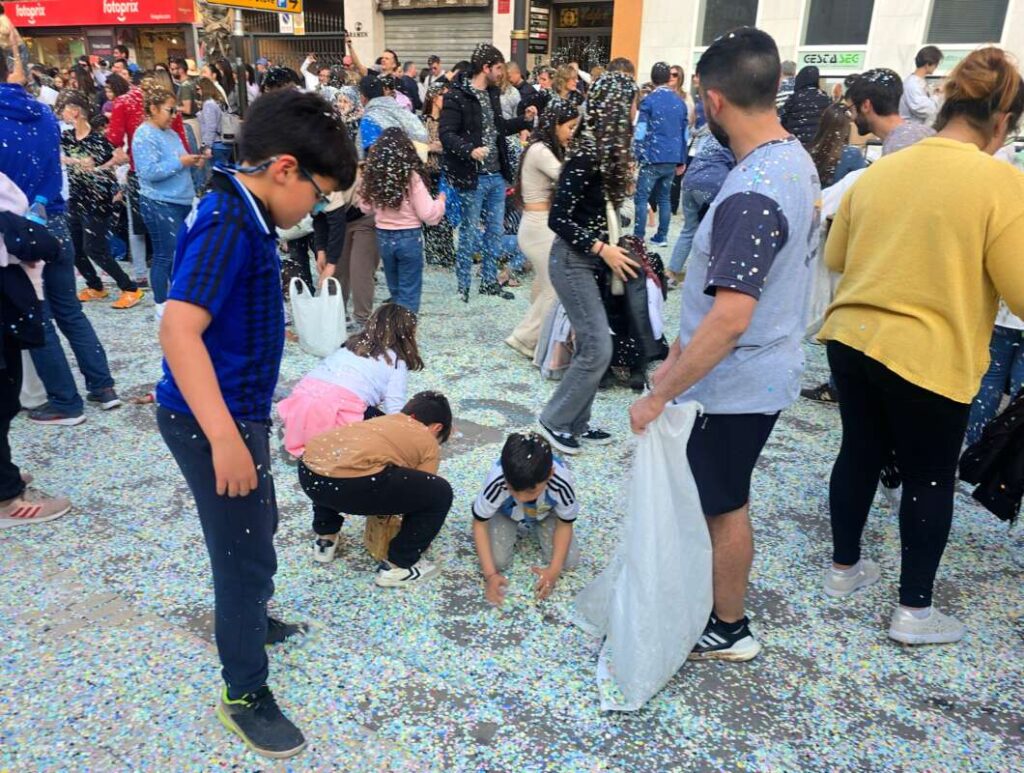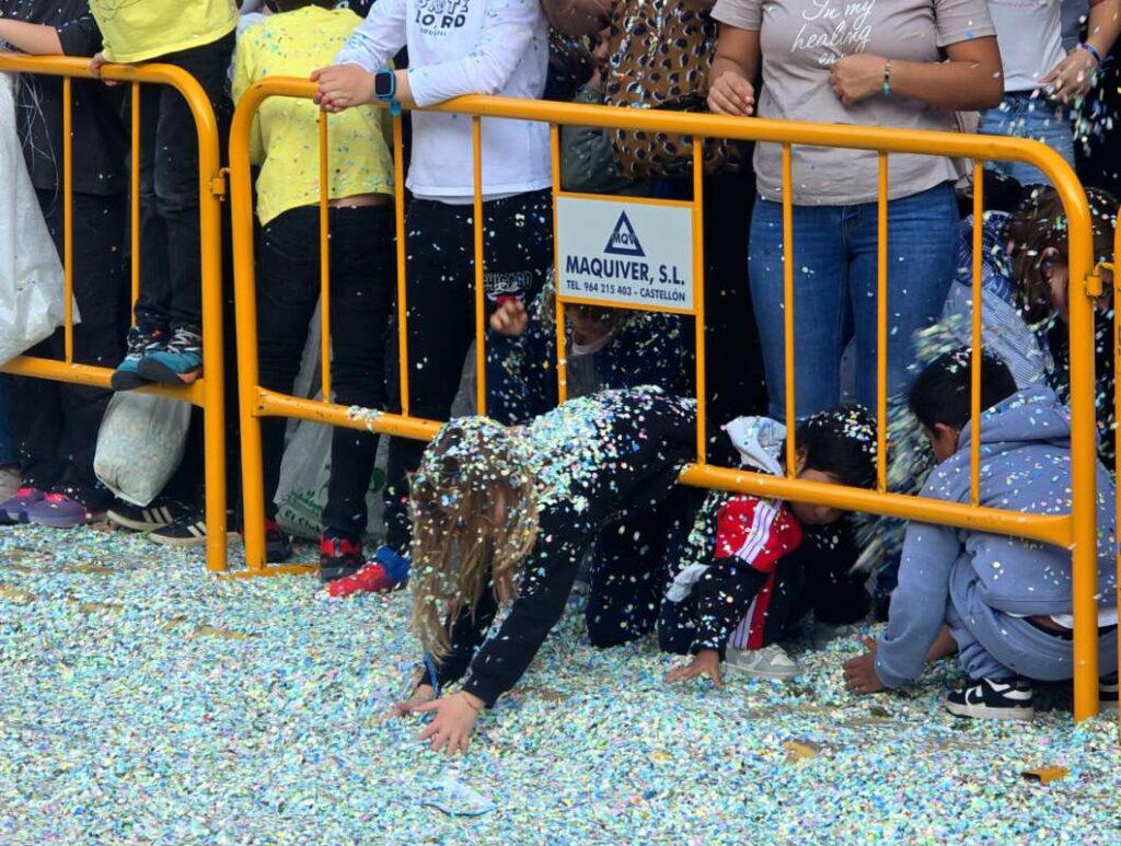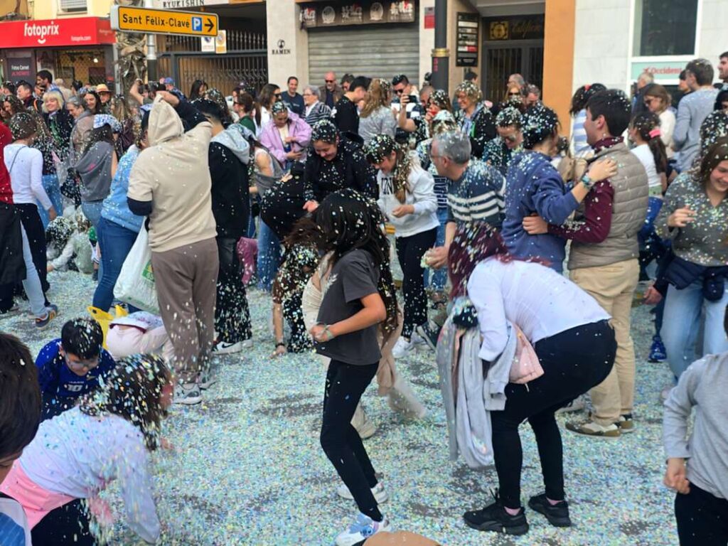 17.00 horas en la Avenida Rey Don Jaime, risas, petardos, música y cientos de niños preparados con bolsas, gafas de buceo, pañoletas para taparse la boca, etc. todo preparativo es poco para la gran batalla del confeti.