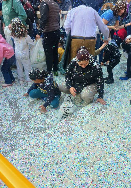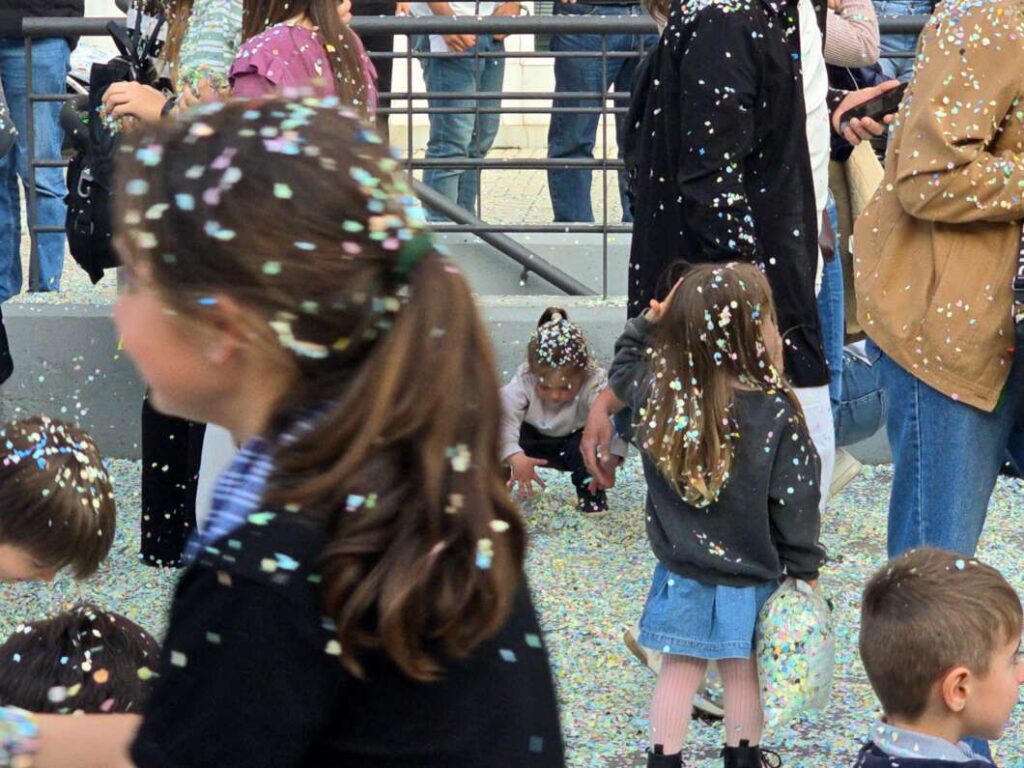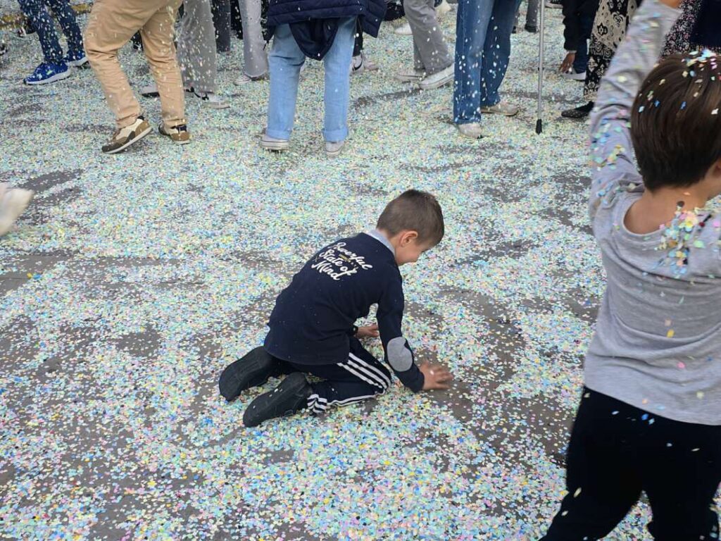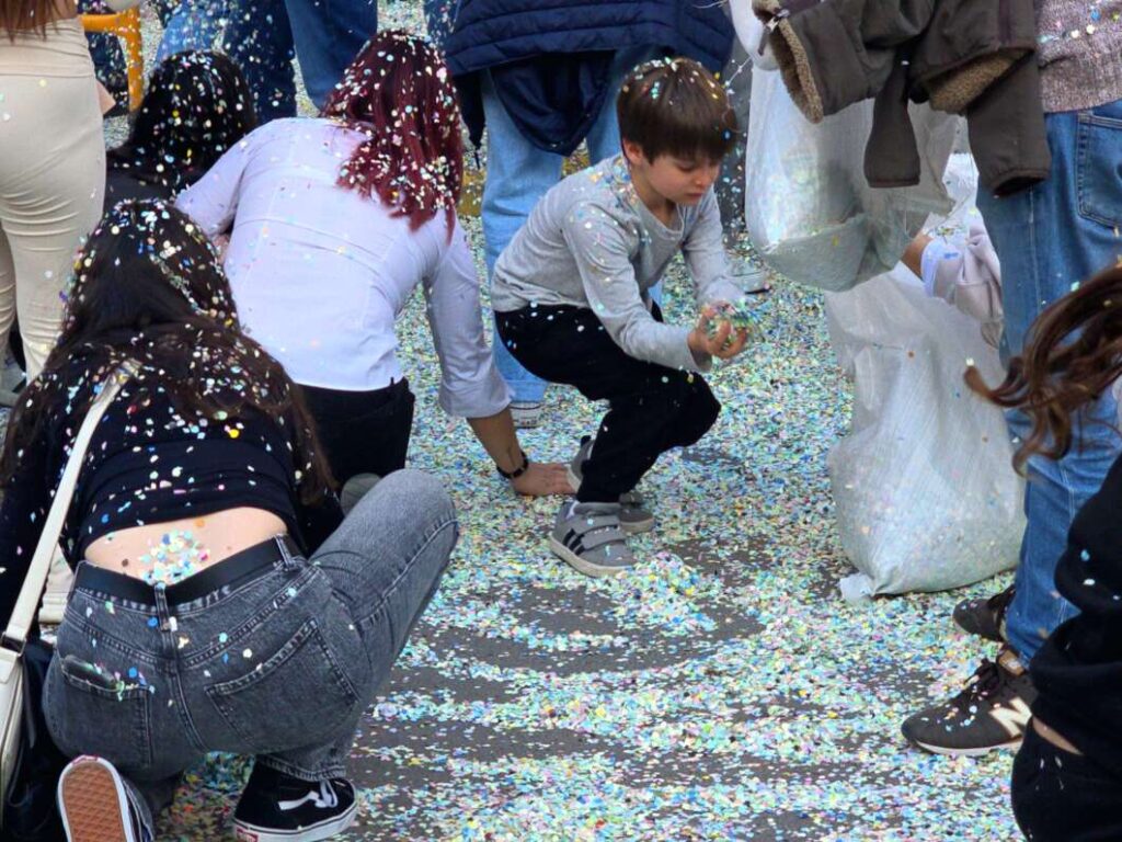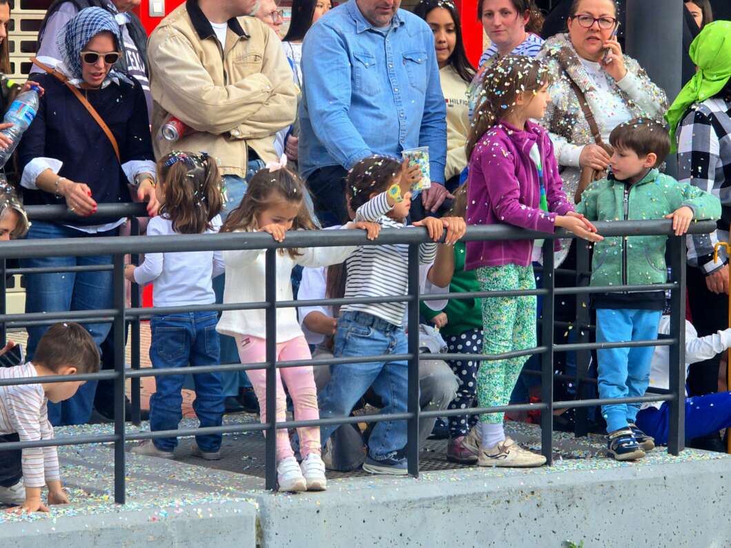 17.00 horas en la Avenida Rey Don Jaime, risas, petardos, música y cientos de niños preparados con bolsas, gafas de buceo, pañoletas para taparse la boca, etc. todo preparativo es poco para la gran batalla del confeti.