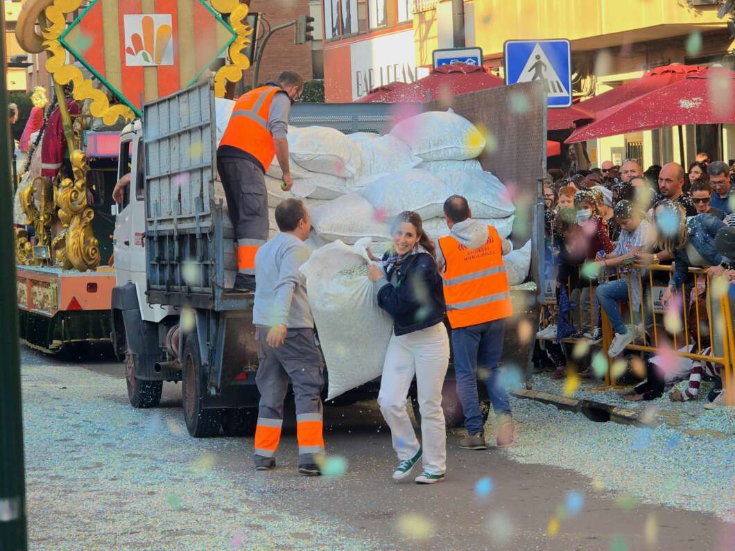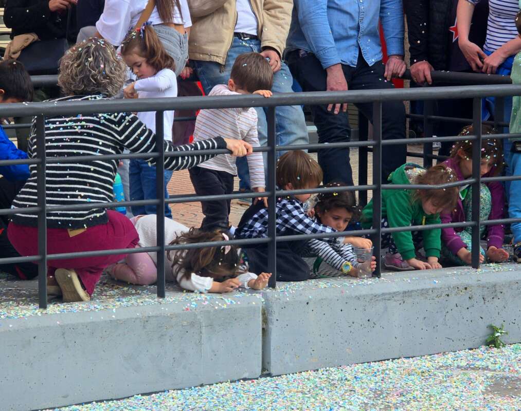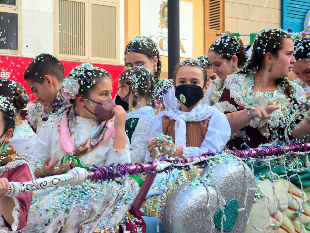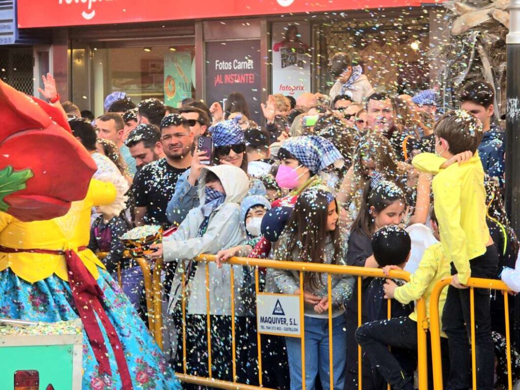 Desde todas y cada una de las carrozas arranca el lanzamiento de sacos y sacos de confeti que nuevamente ha alcanzado la friolera de 5.500 kilos. Es entonces cuando un caos más o menos organizado se vuelve fiesta. Los papelitos de colores velan en todas direcciones, de las carrozas al público, entre los miembros de las mismas carrozas y hacia los niños que se agolpan tras las vallas para participar en la batalla.