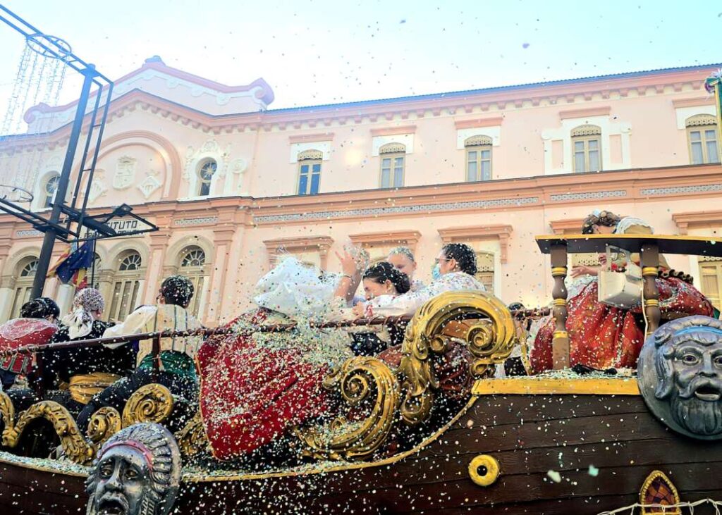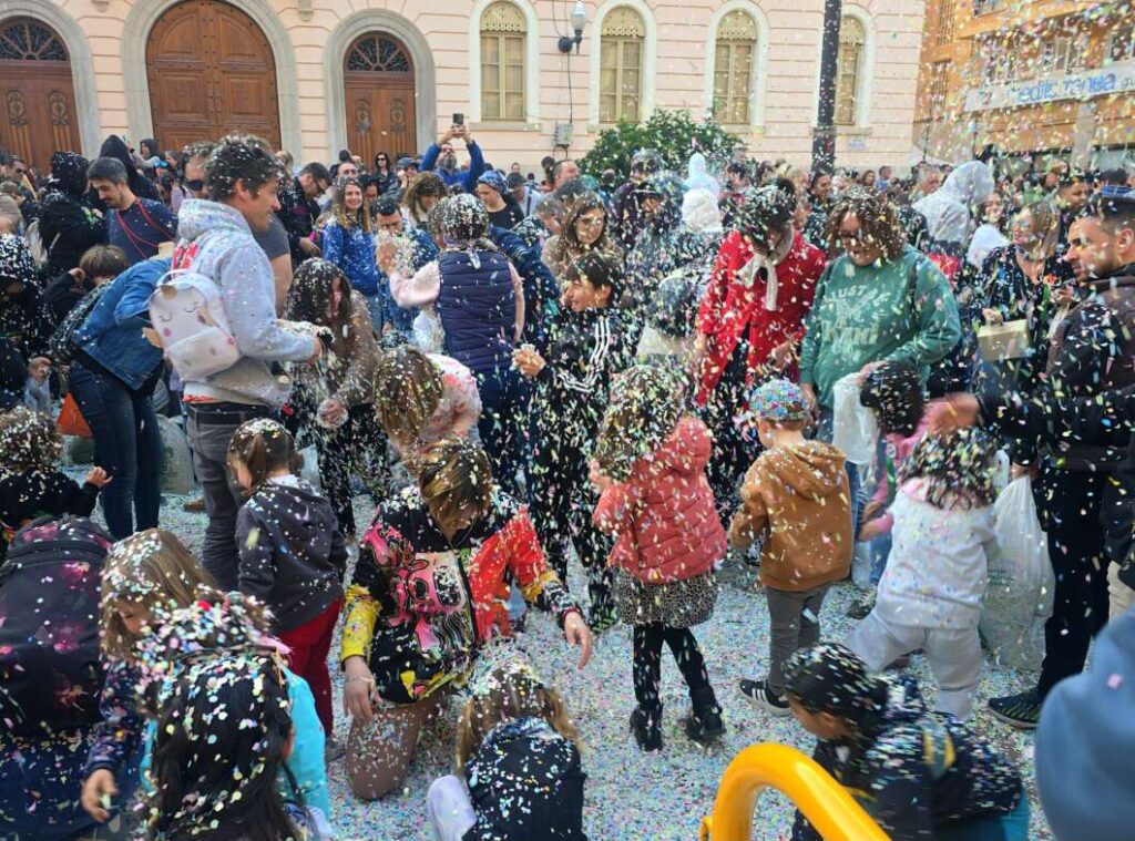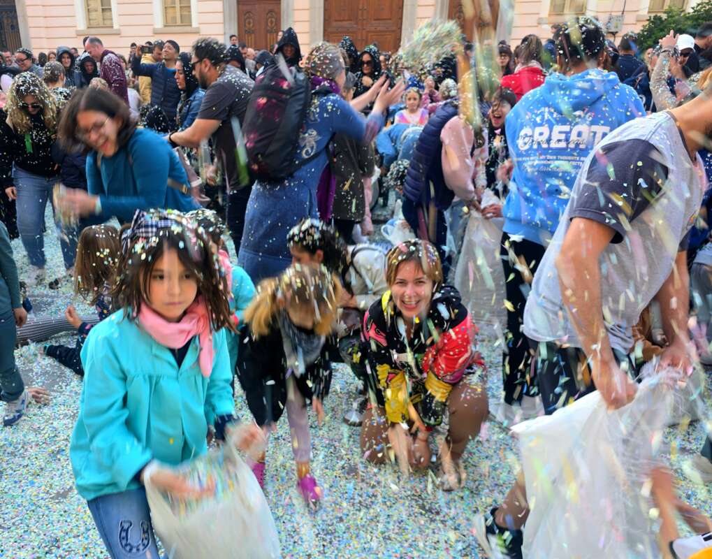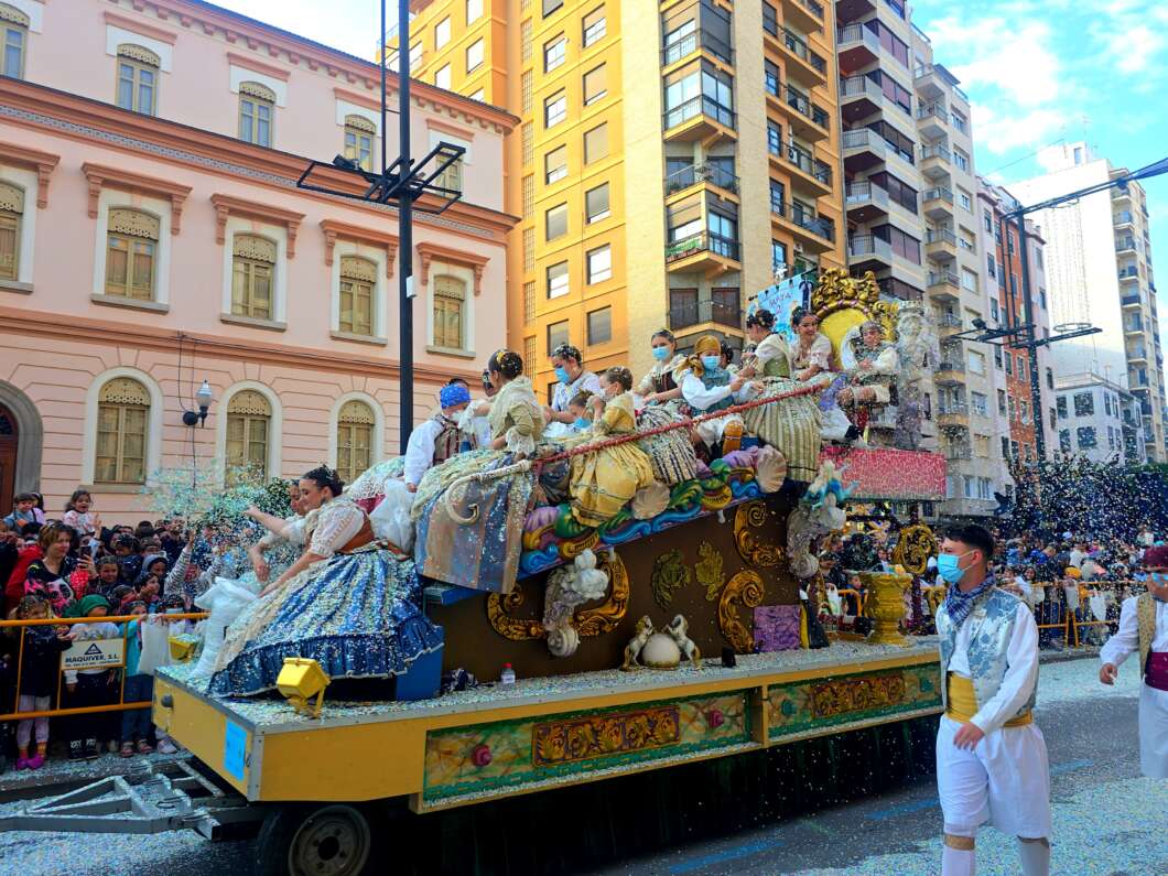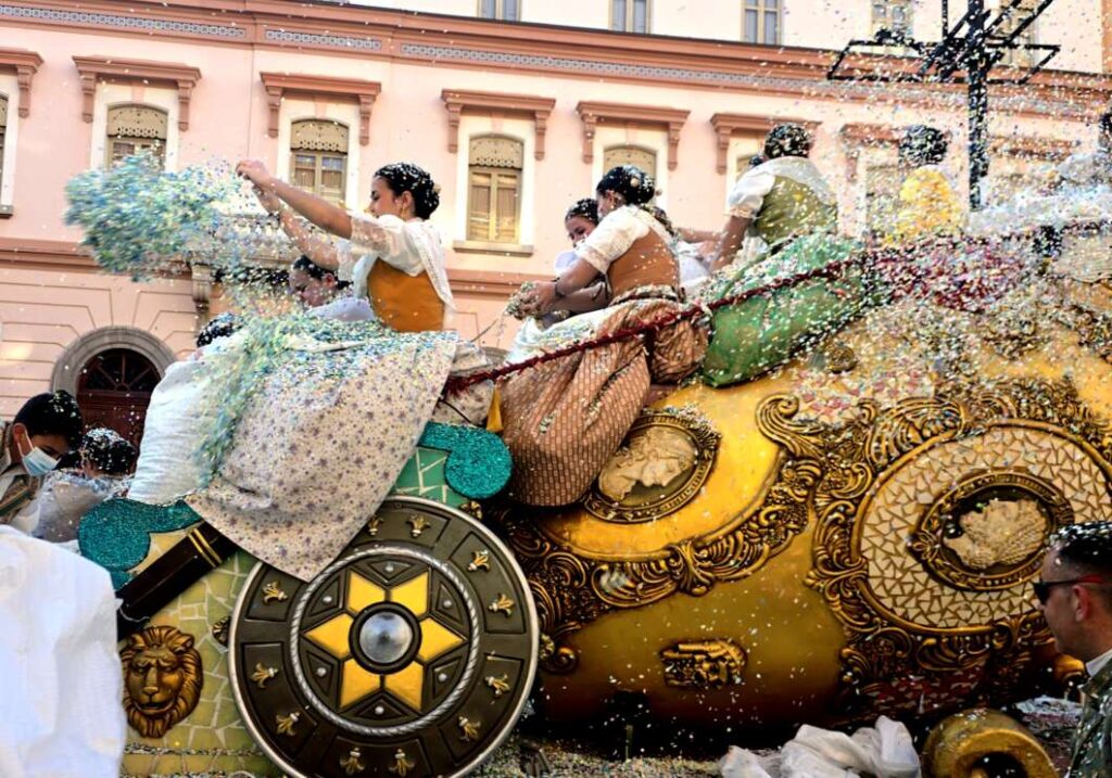 Desde todas y cada una de las carrozas arranca el lanzamiento de sacos y sacos de confeti que nuevamente ha alcanzado la friolera de 5.500 kilos. Es entonces cuando un caos más o menos organizado se vuelve fiesta. Los papelitos de colores velan en todas direcciones, de las carrozas al público, entre los miembros de las mismas carrozas y hacia los niños que se agolpan tras las vallas para participar en la batalla.