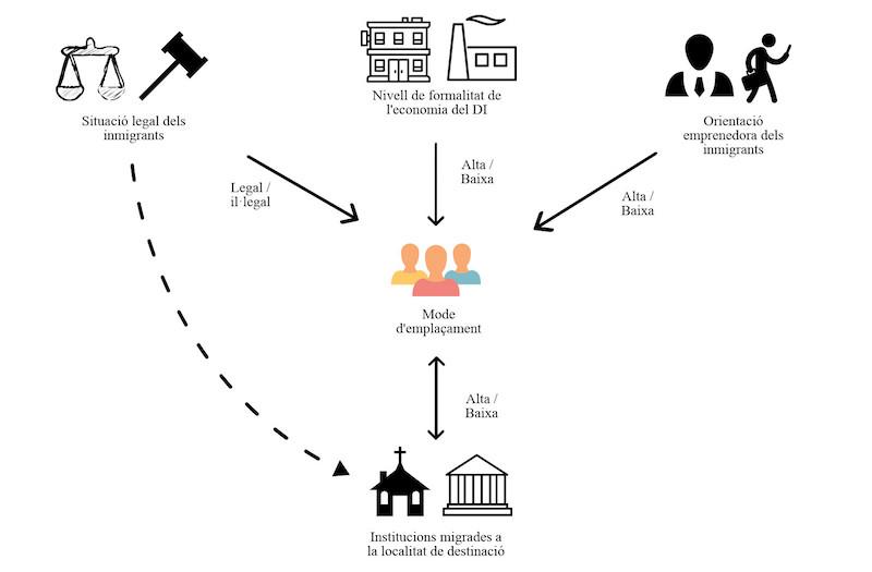 Així, les característiques de formalitat o informalitat laboral del propi districte industrial, junt amb la situació legal i l'orientació emprenedora dels immigrants, interactuen amb les pròpies institucions creades pels immigrants a nivell local, per definir de quina manera aquestes persones s'acaben inserint en l'economia i la vida de les localitats de destí.
