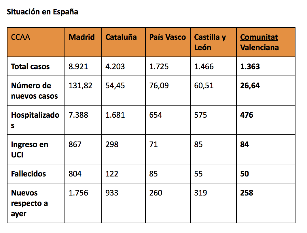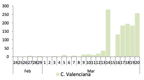 Los casos en la Comunitat han subido a 1.363, frente a los 1.105 de ayer, 476 están hospitalizados, 84 en la UCI y 50 fallecidos, por lo que se producido un repunte importante, como muestra la gráfica posterior, después de unos días con un aumento sostenido.