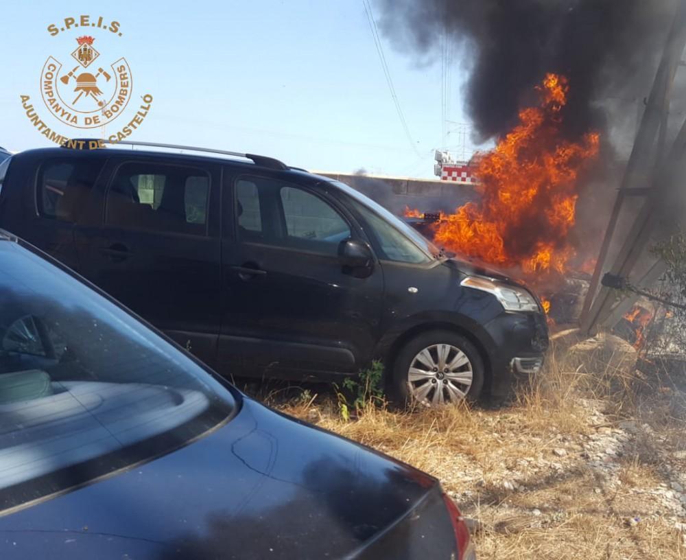 La Policía Local de Castelló, un retén de Bomberos Municipales y varias dotaciones de la Policía Nacional han intervenido esta tarde en el camino Sequiota, situado junto al Grupo Lourdes, debido a un aparatoso incendio que ha provocado daños de consideración a cinco vehículos que estaban estacionados dentro de un solar.