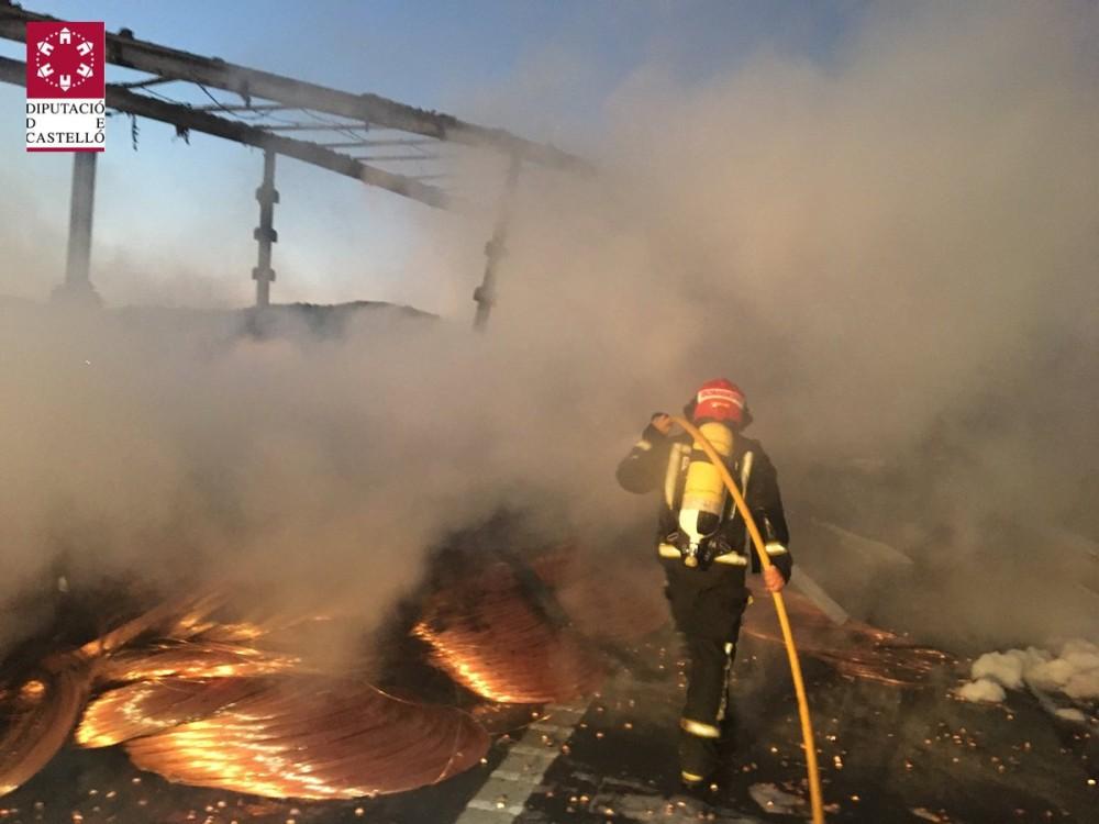 Uno de los camiones, que transportaba cobre, se ha incendiado tras el choque viéndose completamente afectado por el fuego, por lo que los que los efectivos de Bomberos han procedido a extinguir el incendio.