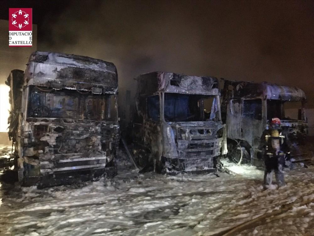Los Bomberos del Consorcio Provincial de Bomberos de Castellón han intervenido en un incendio de varios camiones ocurrido este fin de semana en La Vilavella (Castellón). El incendio se declaró a las 22 horas de la noche del sábado 2, en las instalaciones de un muelle de carga de una empresa frutícola del municipio. Hasta allí se desplazaron los efectivos de Bomberos de los Parques de Plana Baixa y de Alto Palancia pertenecientes al Consorcio Provincial. El fuego se declaró en una zona donde había 5 camiones estacionados, viéndose afectados por el fuego 3 camiones en su totalidad y uno parcialmente, mientras que un quinto camión logró salvarse. Los efectivos de Bomberos también evitaron que el fuego alcanzara el resto de las instalaciones de la empresa.