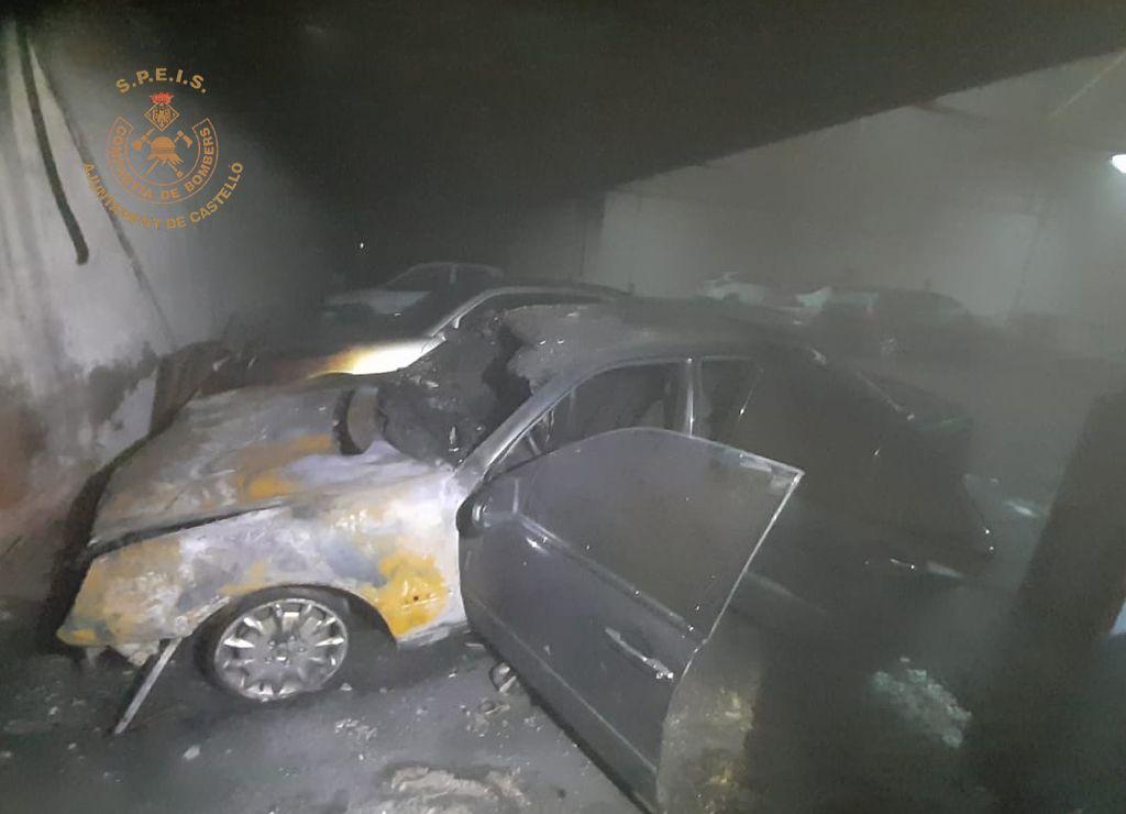 Un retén de Bomberos Municipales y varias dotaciones de la Policía Local de Castelló han intervenido esta tarde en un incendio declarado en un garaje comunitario de un edificio ubicado en la calle Museros que ha provocado daños de consideración a dos vehículos estacionados y un tercero ha resultado dañado en uno de sus laterales.