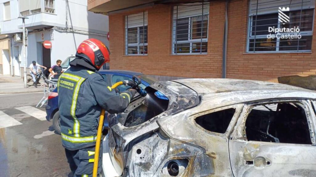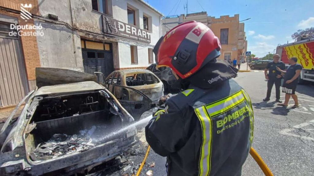 Incendio urbano en Moncofa. La localidad ha registrado este sábado un fuego que ha calcinado totalmente cuatro vehículos estacionados en la vía pública. Tres dotaciones de bomberos del parque de la Plana Baixa se han desplazado rápidamente hasta el lugar, donde han podido extinguir el incendio.