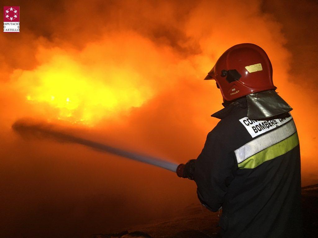 Los bomberos del Parque Baix Maestrat trabajan desde anoche en un incendio industrial que se declaró en una planta de reciclaje de Cervera del Maestre.