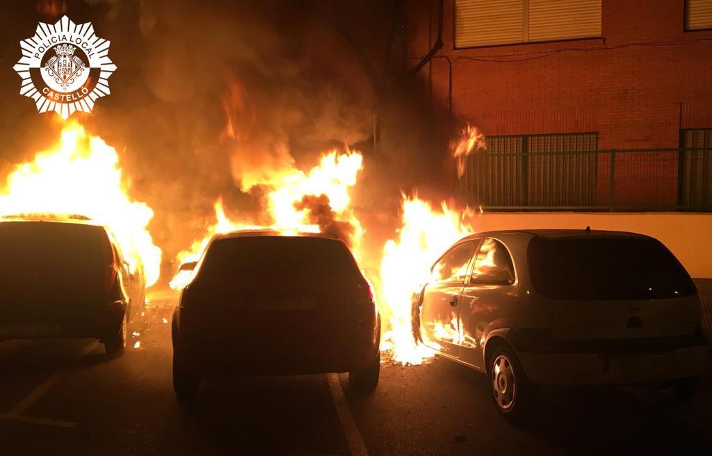 La Policía Local de Castelló y un retén de Bomberos Municipales han intervenido esta madrugada en la calle Cronista Revest a la altura del colegio CEIP Fadrell debido a un aparatoso incendio que ha provocado daños de consideración a cuatro vehículos estacionados en dicho vial. Los hechos se han producido sobre las tres de la madrugada de hoy cuando el Centro Integral Municipal de Seguridad y Emergencias 092 ha recibido las llamadas de varios vecinos que informaban que en la calle Cronista Revest habían dos turismos envueltos en llamas. Inmediatamente se ha desplazado hasta el lugar del siniestro una patrulla de la Policía Local de Castelló, cuyos agentes, al llegar a la citada calle, han observado una gran columna de humo negro y tres vehículos que estaban afectados por las llamas por lo que han solicitado con urgencia la presencia de los servicios de extinción de incendios para apagar el fuego.
