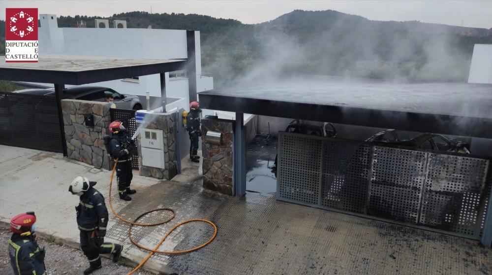 Dos vehículos han quedado totalmente calcinados tras incendiarse en el exterior de una vivienda de la urbanización de la Coma en Borriol.