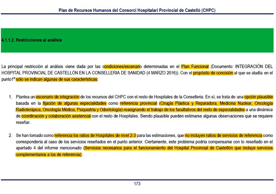 En otro de los apartados, el Informe se centra única y exclusivamente sobre el Hospital Provincial y los puestos de trabajo por acúmulo de tareas, que el Tribunal Laboral de Arbitraje pidió que se regularan. En este aspecto, se realizan estimaciones de ratios y sanitarios en el Hospital Provincial, referenciados en las tablas generales nacionales, y sumando, como si ya fueran uno, los pacientes del Hospital Provincial, del General, y los ratios. Son los siete famosos folios que la consellera Carmen Montón identificó inicialmente como toda justificación de los despidos del Provincial el pasado 26 de octubre.