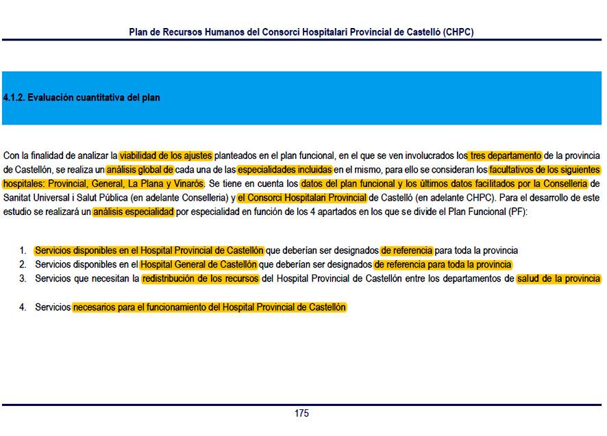 Pero sobre estas tablas, se aplican posteriormente los datos facilitados por la Conselleria de Sanidad y el Consorcio del Hospital Provincial, en relación con el número de facultativos, especialidades y servicios. Y se aplican sobre una premisa completamente hipotética, que condiciona resultados y conclusiones.