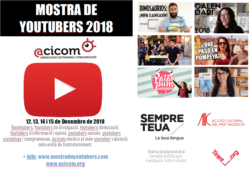 Acicom ha organitzat per als dies 12,13,14 i 15 de Desembre una Mostra de Youtubers que pretén visibilitzar les iniciatives més ciutadanes i compromeses dins del món de youtube valencià.