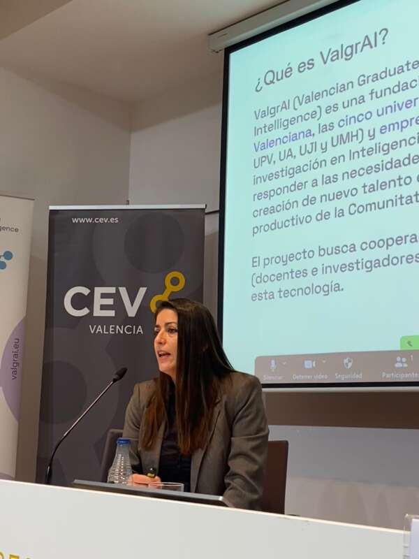 La Directora Gerente de ValgrAI, Ana Cidad, en su intervención ha alentado a las Pymes a sumarse a la IA sin temor, puesto que desde la entidad que representa se ofrece no sólo asesoramiento y consultoría a las empresas para que la adopción e implementación de la IA se produzca de una forma sosegada y satisfactoria, sino que además se ofrece formación tanto para gerentes como para personal técnico, de la mano de destacados profesores e investigadores de las cinco universidades públicas valencianas: Universitat de València, Universitat Politècnica de València, Universitat Jaume I, Universitat d’Alacant y Universidad Miguel Hernández.