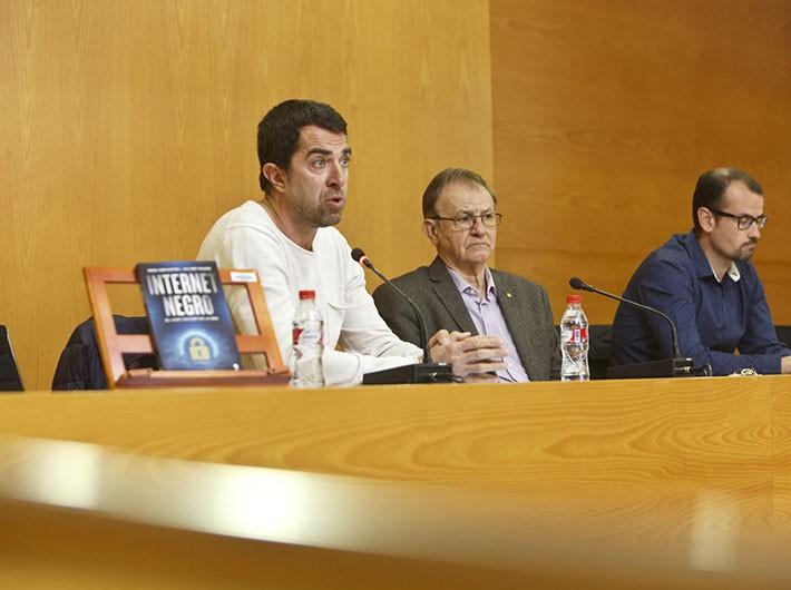 La importancia de educar para tomar las medidas necesarias ante los riesgos que entraña la red y los delitos informáticos son temas que se han tratado en la conferencia ofrecida por Pere Cervantes y Oliver Tauste con motivo de la presentación de su libro Internet Negro en el marco de las actividades programadas por la Biblioteca de la Universitat Jaume I en la semana dedicada al Día del Libro. El coloquio se ha celebrado el día 19 de abril de 2016 en el Salón de Actos del edificio Escuela de Doctorado, Consell Social y Postgrado.