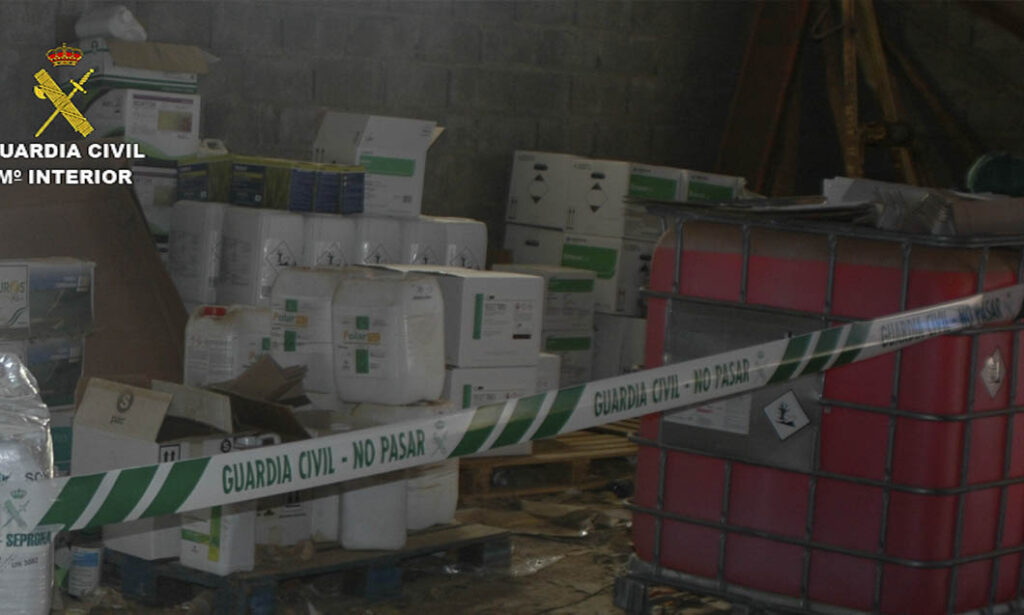 Durante esta investigación se tuvo conocimiento de la existencia de dos naves agrícolas en las que se almacenaban estos productos que no contaban con ningún permiso o autorización, para su posterior venta y distribución a los agricultores de la comarca. En el interior de estas se encontraron almacenados casi 3.940 litros de productos químicos. Además, se comprobó que dichas naves no cumplían con las condiciones exigidas por la normativa que regula el almacenamiento de los productos químicos.