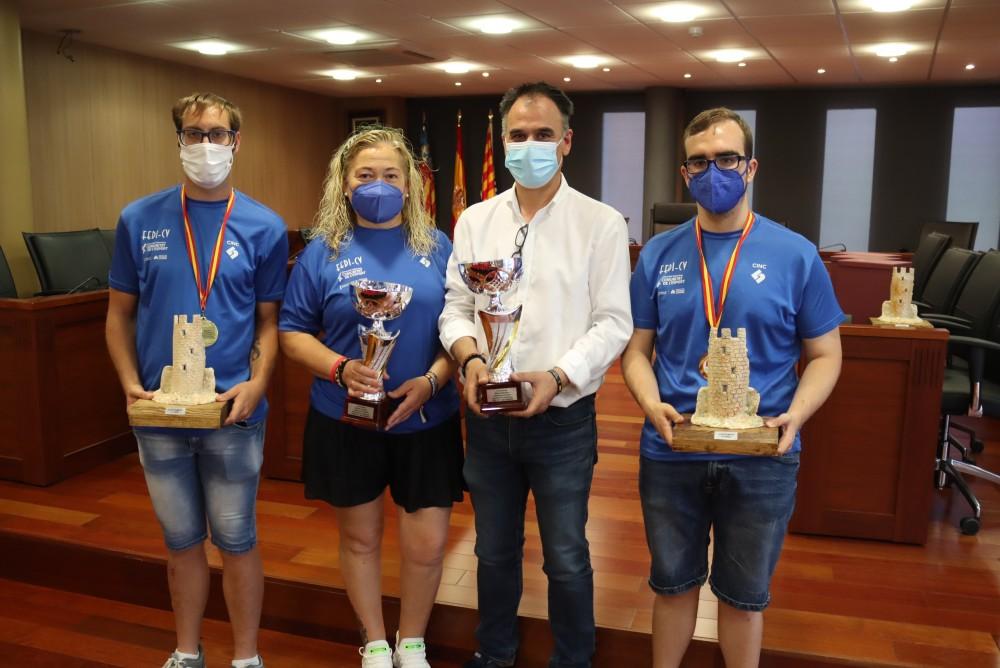 El Ayuntamiento de Onda ha celebrado un acto para recibir a los nadadores ondenses Eric Villegas y Pablo Huguet, tras proclamarse vencedores en el campeonato de España de Selecciones Autonómicas FEDDI 2021 que se ha celebrado en Cádiz. En el acto, también se ha recibido a la entrenadora y seleccionadora ondense, Eli Cortés, por su buena gesta, que ha hecho que los nadadores representantes de la Comunidad Valenciana, tanto en categoría masculina como femenina, consiguieran el oro.