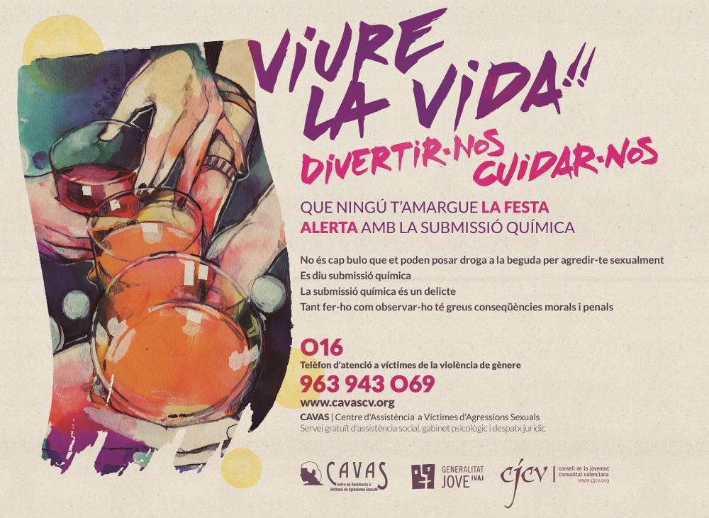 El Institut Valencià de la Joventut (IVAJ) desarrolla en estos días de fiestas, por segundo año consecutivo, una campaña informativa dirigida principalmente a la juventud, a través de las redes sociales y de carteles, bajo el lema 'Vivir la vida, divertirnos', con el objetivo de prevenir y evitar las agresiones sexuales perpetradas utilizando la sumisión química.