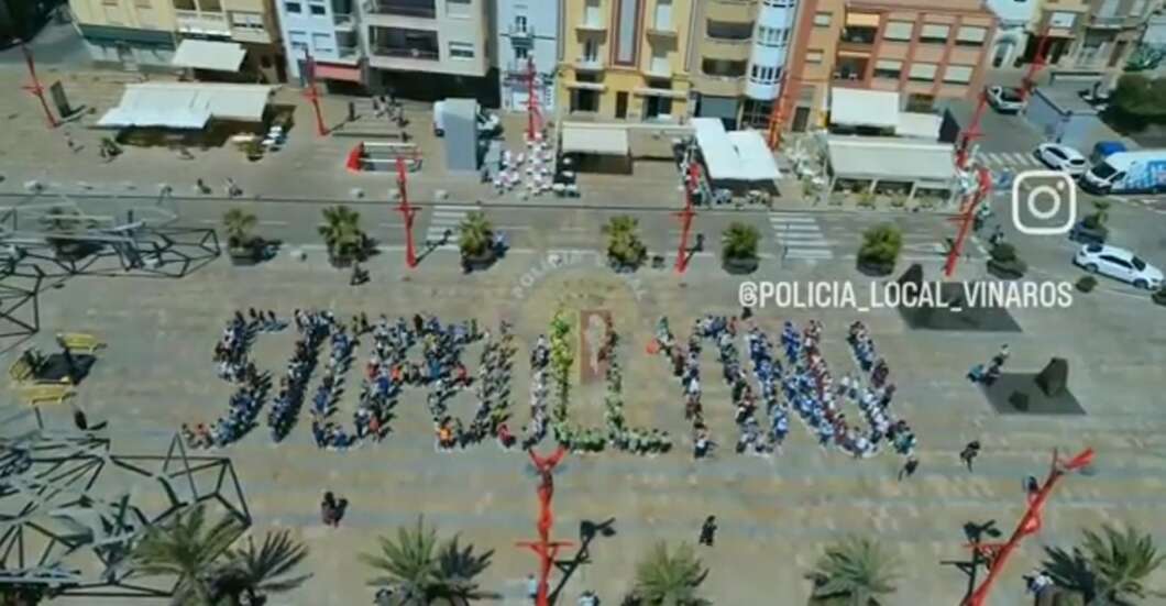 Una de las actividades realizadas en la jornada fue la realización de un gran mosaico en el tramo Colón del paseo marítimo en que alumnos de estos centros educativos formaron la palabra Stop bullying, como muestra el video realizado por el dron de la Policía Local.