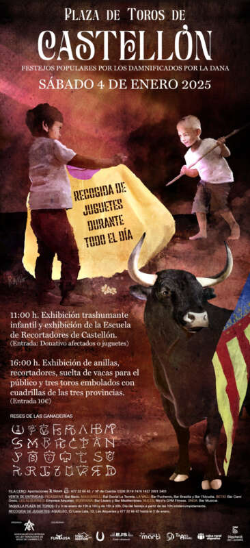 Associació en Defensa de les Tradicions de Bou al Carrer también ha habilitado una fila 0 a través del teléfono 677 22 66 42 y el numero de cuenta ES36 3119 7476 1427 2001 3401. La recogida de juguetes también se amplía a los días previos en la empresa Alquelec de les Alqueries y durante todo el día 4 en la Plaza de Toros de Castellón.