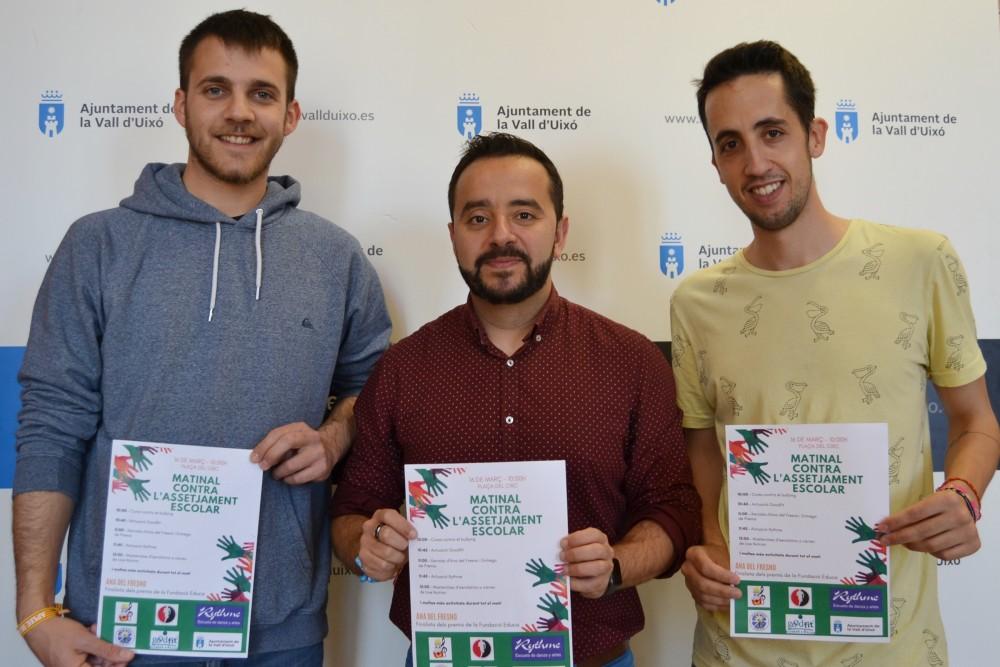 La falla Ja Estem Tots y el Ayuntamiento de la Vall d'Uixó han presentado la matinal contra el acoso escolar que se celebrará este sábado, 16 de marzo, a las 10.00 horas, en la plaza del Circo. Las actividades constarán de una carrera de deporte escolar, exhibiciones de Goodfit y Rythme, una master class de aerolatinos a cargo de Live Nutrition y una charla de Ana del Fresno, maestra finalista de los premios de la Fundación Educa.