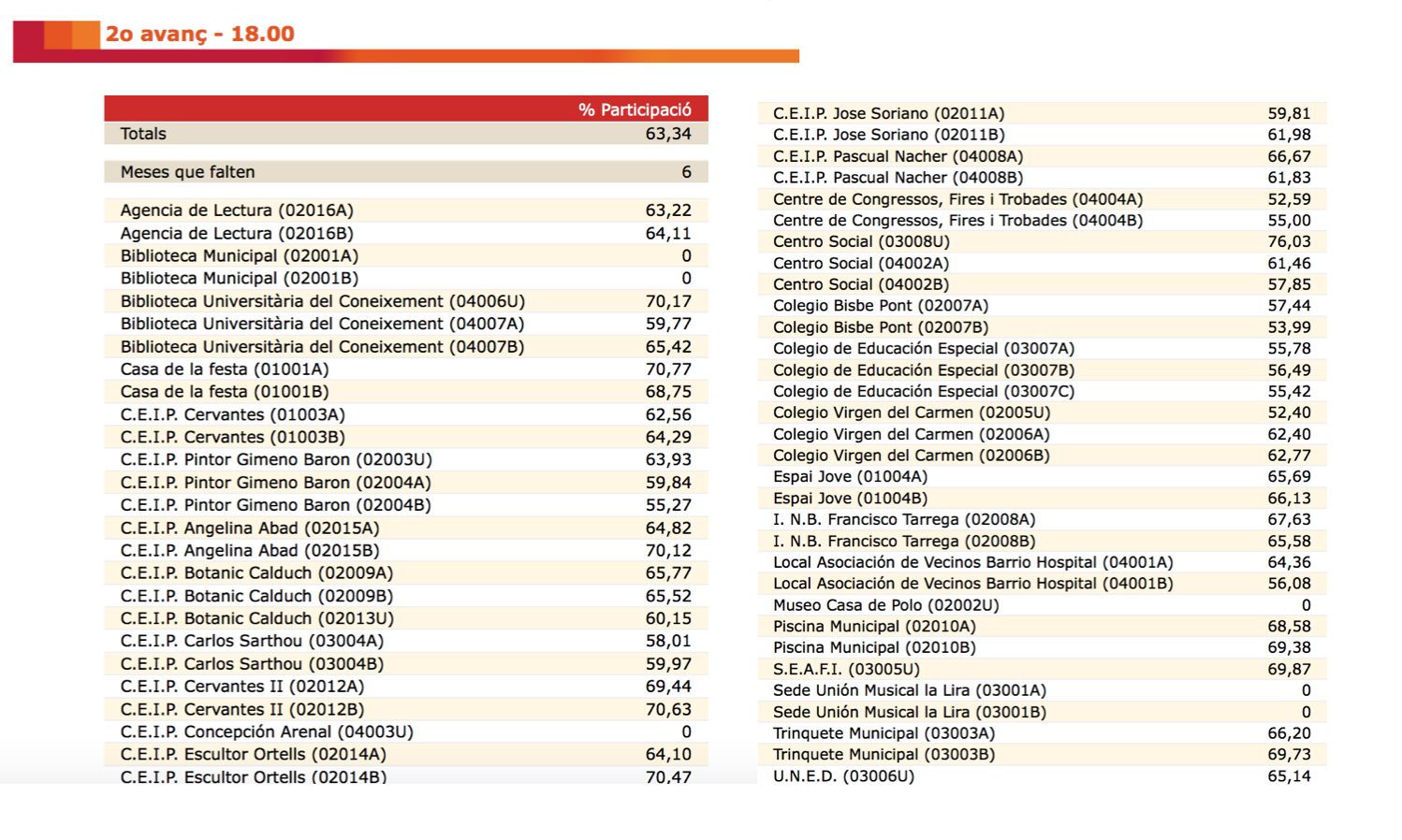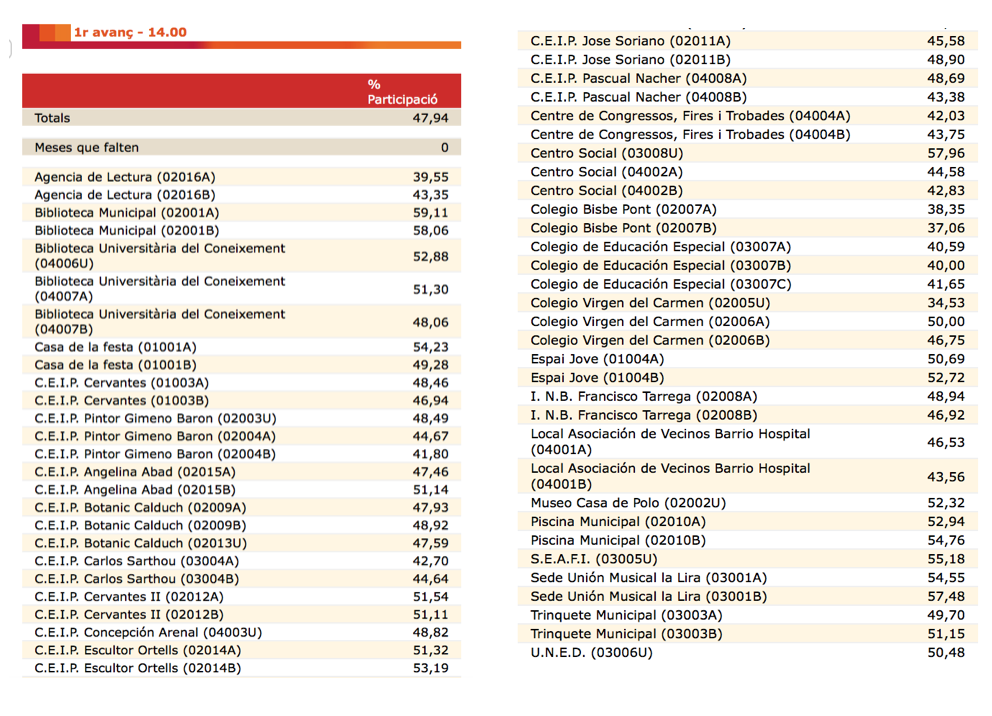 Captura de pantalla 2019-04-28 a las 16.51.18Els veïns i veïnes de Vila-real han tingut a la seua disposició en aquesta jornada electoral atípica, per congregar eleccions nacionals i autonòmiques, prop de 60 taules electorals, en concret 58, repartides de nord en sud col·legis públics, edificis municipals, biblioteques, Assocacions de Veïns, entre altres. Destaca la participació de quasi un 48% a les 14.00, en concret un 47,94, i per damunt del 50%, en els col·legis electorals de la Biblioteca Municipal, la BUC, l’Espai Jove, el Museu de la Casa Polo, la Piscina Municipal, el S.E.A.F.I. o la seu de la Unió Musical la Lira, amb quasi un 58% en una de les taules.