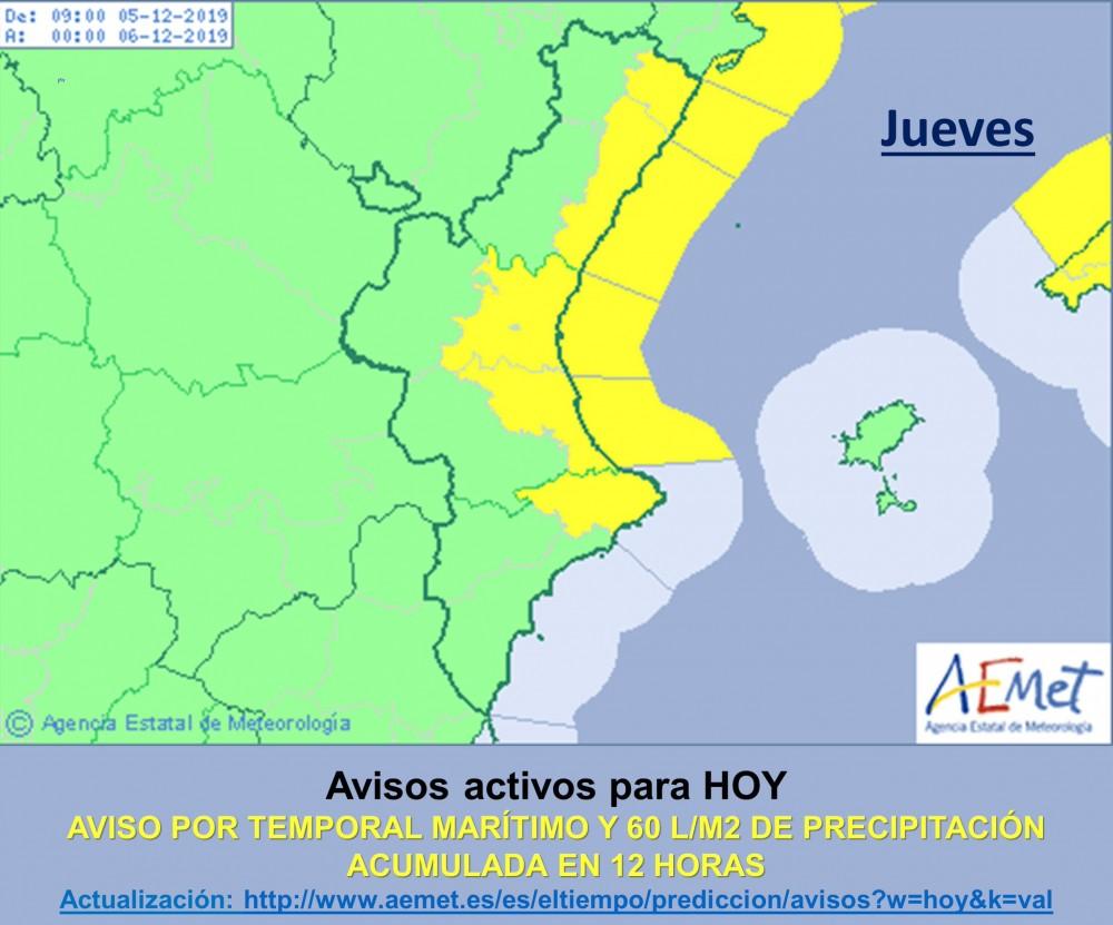 No obstante se mantiene el aviso amarillo por temporal marítimo y por 60 l/m2 de precipitación acumulada en 12 horas en el litoral de Castellón donde sigue habiendo mala mar, con mar gruesa y olas de más de 2.5 metros.