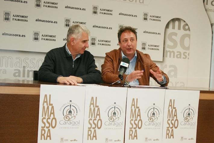 El regidor de Comerç, Santiago Agustí, i el president de l'associació de professionals i comerciants Aproca, Javier Navarro, han presentat aquest migdia les I Jornades del caragol i el xanet que se celebraran a Almassora entre el 2 i el 25 de juny. Aquesta nova iniciativa sorgeix com a al·licient per a atraure turistes a la localitat al començament de l'estiu aprofitant el reclam de la cuina local.