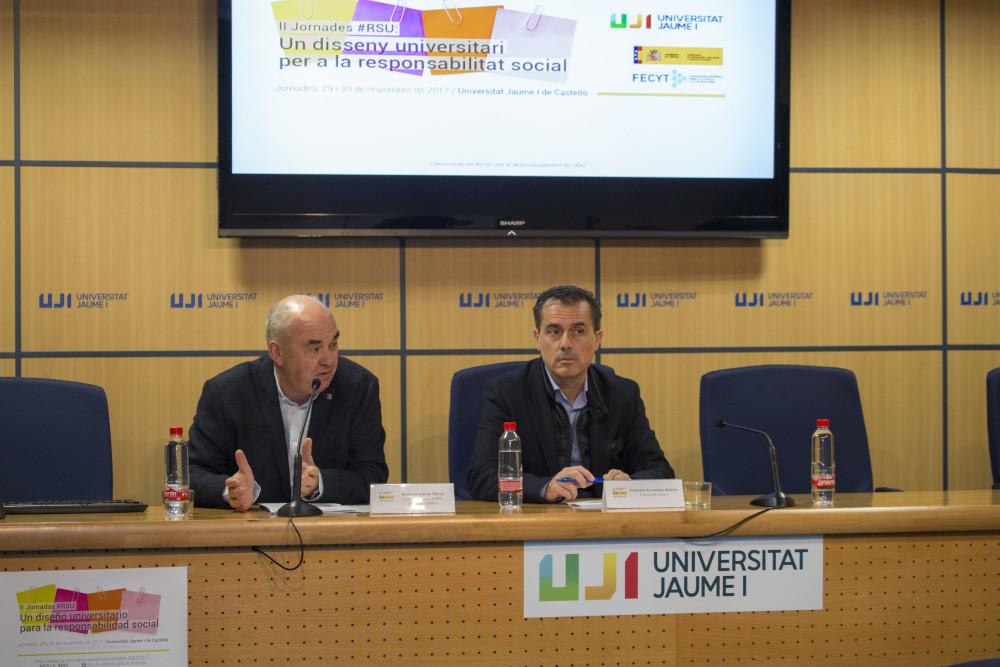 Les 'II Jornades RSU: Un disseny universitari per a la responsabilitat social' han reunit els dies 29 i 30 de novembre de 2017 en la Universitat Jaume I a més de mig centenar d'assistents procedents de 14 universitats espanyoles. Al llarg de dues sessions, vicerectors, tècnics, acadèmics i investigadors han debatut sobre les últimes estratègies i avanços en els àmbits de la Responsabilitat Social Universitària (RSU) i la Recerca i Innovació Responsables (RRI per les seues sigles en anglès). En aquest sentit, des de l'UJI s'ha presentat el Pla de Responsabilitat Social Universitària que s'està desenvolupant sobre la base d'un innovador sistema de gestió que avale el compliment del recentment elaborat Codi Ètic de la Univerisitat, així com l'estudi realitzat en l'àmbit de la RRI per a avançar cap a un major i millor diàleg entre ciència i societat a Espanya. L'estudi, així com les jornades, compten amb la col·laboració de la Fundació Espanyola per a la Ciència i la Tecnologia (FECYT).