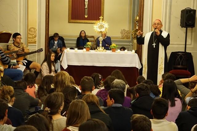 “D. Casimiro, tendremos que pensar en cambiar de lugar”, decía el delegado de juventud, D. José Miguel Sala, al obispo ante la respuesta cada vez más numerosa de jóvenes a la vigilia en el Obispado. Es la quinta edición, y el número no deja de crecer. En esta ocasión, la tonalidad ha sido de cuaresma, pero para nada triste: “Como dice el Papa Francisco –explicaba mons. López Llorente a trescientos chicos y chicas-, el encuentro con Jesús llena nuestra vida entera de alegría”. Y la Cuaresma, decía, es ocasión para encontrarse con Cristo: “Imaginad el pasaje en que Jesús llama a sus discípulos a estar con Él; esta noche nosotros somos sus discípulos”.
