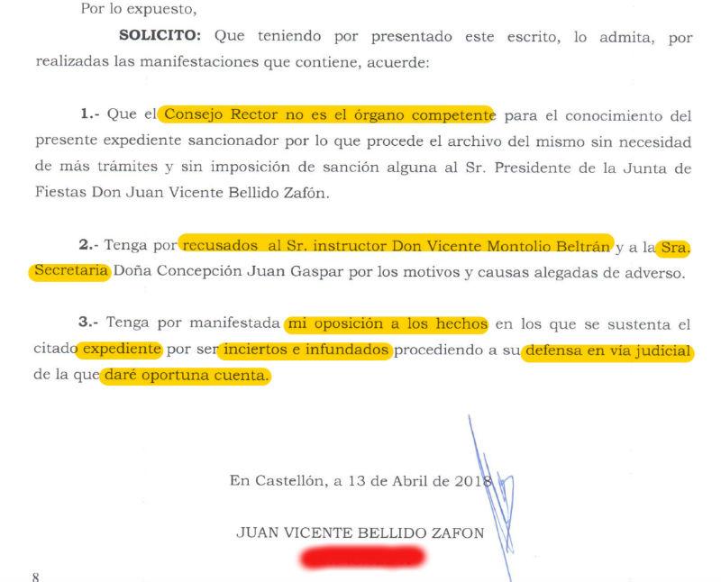 El presidente de la Junta de Fiestas, Juanvi Bellido, ha respondido a la notificación de la apertura de su expediente disciplinario, a través de un escrito de alegaciones presentado en el registro. En él, cuestiona la parcialidad y competencias del Consejo Rector, recusa al instructor de su expediente y la secretaria municipal, niega el fundamento de las acusaciones y afirma que se defenderá en los tribunales porque entiende que serán más imparciales en el conflicto.