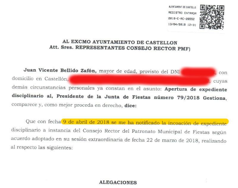 El presidente de la Junta de Fiestas de Castellón, Juanvi Bellido, ha presentado hoy en el Registro municipal las alegaciones oportunas, tras haber recibido comunicación de la apertura del expediente disciplinario, en su contra, acordado por mayoría en el consejo Rector de las Fiestas.