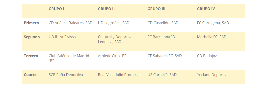 Los acuerdos, publicados esta mañana, han determinado los campeones de cada uno de los grupos, que han quedado de la siguiente manera: Atlético Baleares (Grupo I); Logroñés (Grupo II);  Castellón (Grupo III) y  Cartagena, (Grupo IV).