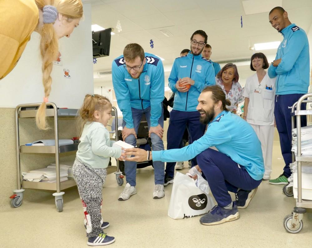 El equipo de voleibol ha recorrido la planta de Pediatría y el Hospital de Día Pediátrico y les han hecho entrega de una taza conmemorativa, intentando mejorar así su estancia durante estas fechas tan señaladas para los más pequeños.