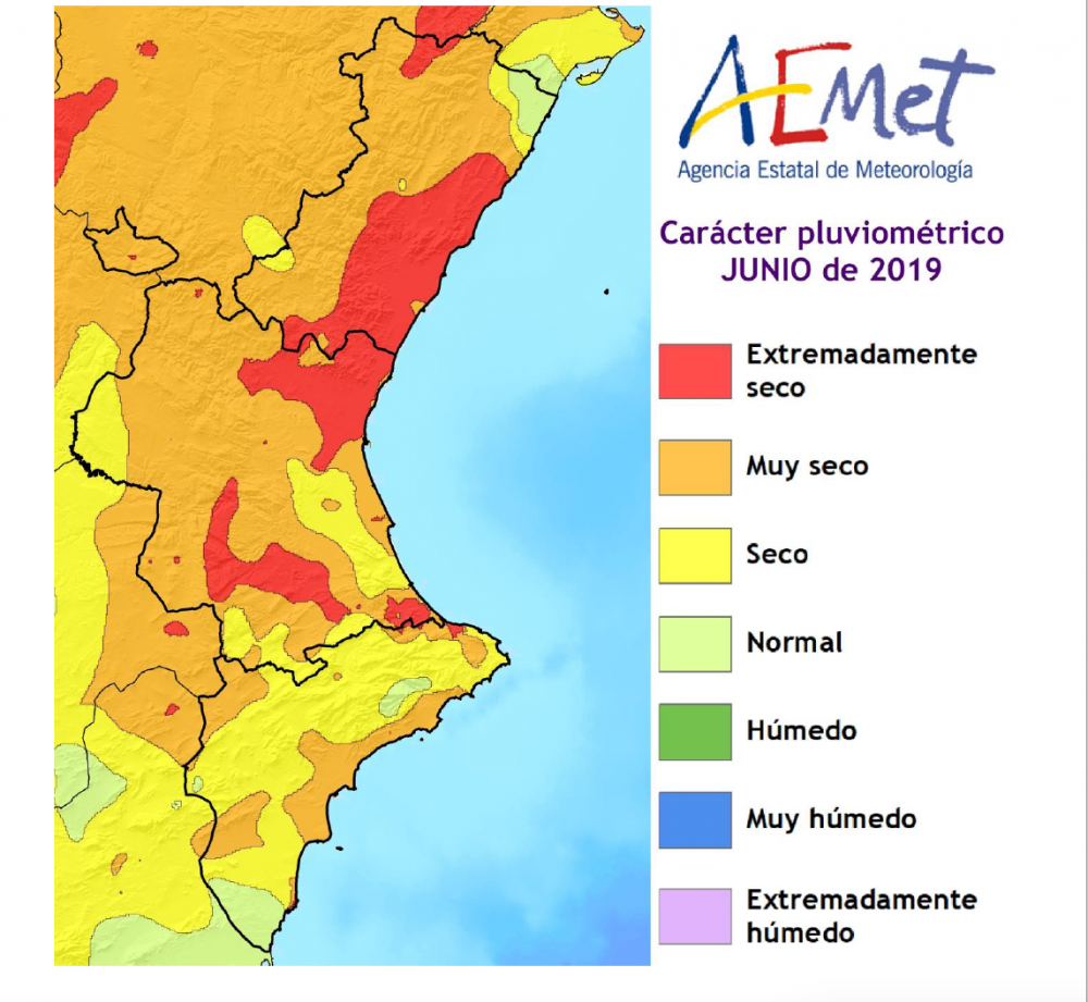 Junio, que ha sido extremadamente seco, no ha sido una excepción en gran parte de nuestro territorio durante la primera mitad del año 2019. El temporal del mes de abril, que afectó sobre todo a la mitad sur, se puede considerar que ha sido el único episodio de lluvia importante del año. Así, en gran parte del litoral de Valencia, desde Cullera y hacia el norte, y en amplias zonas de Castellón, la precipitación acumulada en los seis primeros meses de 2019 es inferior a la mitad de lo que suele ser normal.