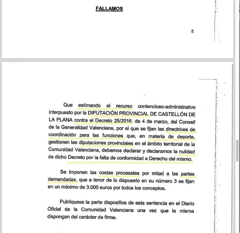 El Tribunal Superior de Justicia de la Comunidad Valenciana ha declarado nulos los decretos del Consell de marzo de 2016, que pretendían intervenir en las competencias de las diputaciones provinciales en materia de Deportes y de Turismo. El tribunal no ha llegado siquiera al fondo del asunto porque en la forma, indica la sentencia, ambas disposiciones son contrarias a derecho. El presidente Javier Moliner ha comparecido ante la prensa, visiblemente satisfecho.