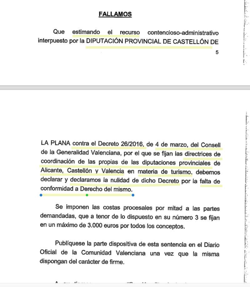 El Tribunal Superior de Justicia de la Comunidad Valenciana ha declarado nulos los decretos del Consell de marzo de 2016 y ha declarado la ilegalidad de ambas disposiciones que pretendían intervenir las cuentas de la Diputación en materia de Turismo y Deportes.