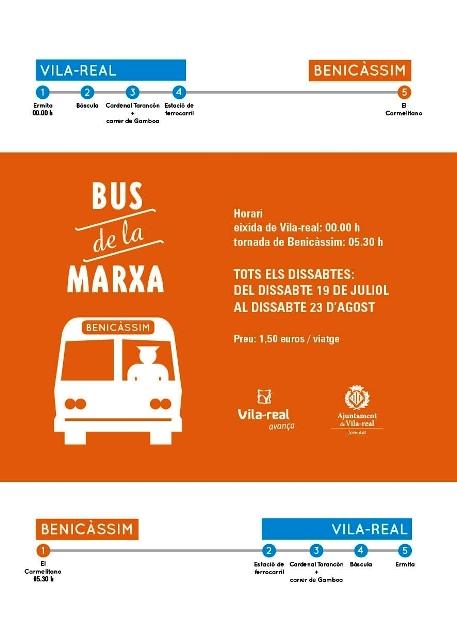 El sábado 19 de julio saldrá el primer bus de la marcha desde la parada de la ermita a las 00.00 horas. A partir de este fin de semana, el autobús hará la ruta desde Vila-real a Benicàssim, con salidas los sábados 19 y 26 de julio y 2,9,16 y 23 de agosto, desde las 00:00 horas y con regreso desde Benicàssim a las 05.30 horas. El autobús parará, tanto a la ida como a la vuelta, en la ermita, la báscula, la avenida Cardenal Tarancón con calle Gamboa y frente a la estación de tren, de forma que dará cobertura a diferentes puntos de la ciudad. En Benicàssim, la parada será delante del Carmelitano. El billete se mantiene al mismo precio, 1,50 euros por viaje.