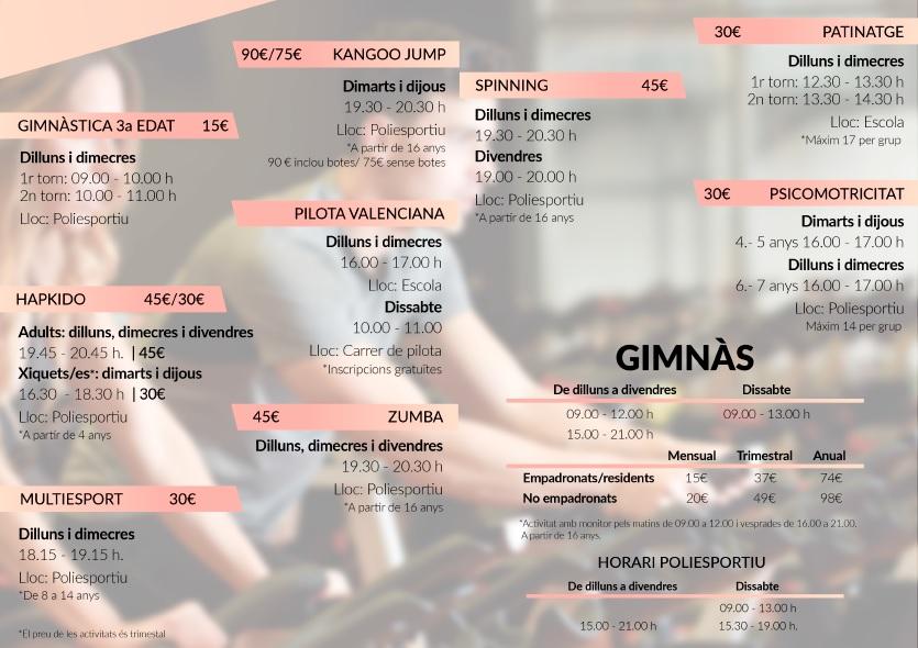 No faltaran les classes de zumba tres dies a la setmana, enguany amb nova monitora, igual que la classe de spinning també durant tres jornades setmanals. També hi haurà classes de patinatge, hapkido, psicomotricitat i gimnàstica per a la tercera edat. També s'apostarà per la pilota valenciana amb tres sessions setmanals i inscripció gratuïta. A més els clubs també ofereixen les escoles de triatló, tennis i handbol.