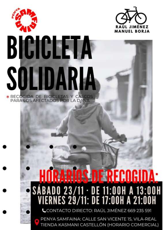 Nueva iniciativa solidaria de la ciudad de Castellón. La peña Samfaina ha organizado una recolecta de bicicletas y cascos para ayudar a los afectados por la DANA de la provincia de Valencia, en concreto a todas aquellas personas que han perdido sus vehículos debido a las inundaciones, así como a los niños y niñas que se han quedado sin juguetes.