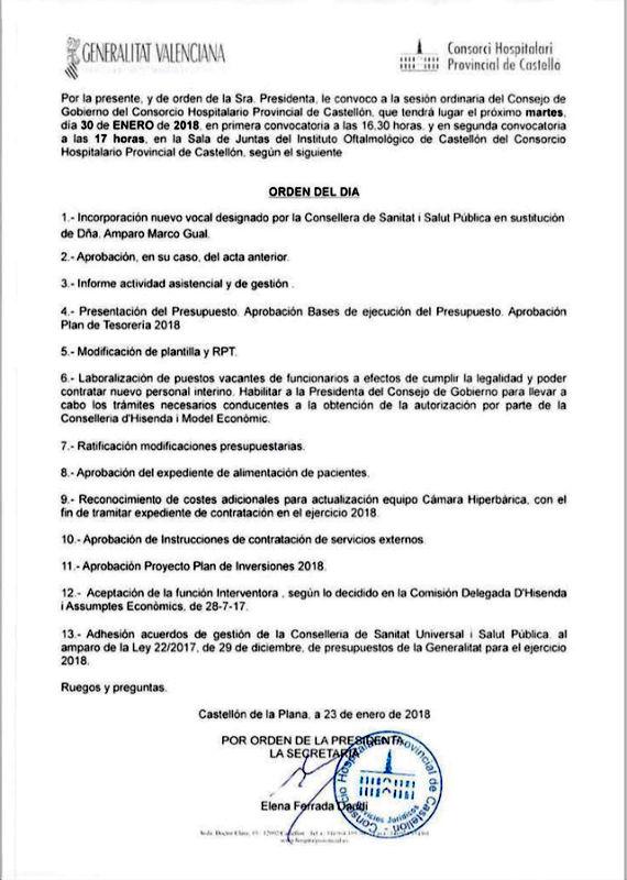 Lo que más destaca a primera vista de la Convocatoria oficial es el punto número uno, en el que cita, textualmente: “Incorporación nuevo vocal designado por la Conselleria de Sanidad i Salut Pública en sustitución de Dña Amparo Marco”.