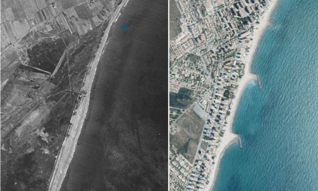 A continuación, dos imágenes de la playa Heliópolis en 1945 (izquierda) y 2021 (derecha).