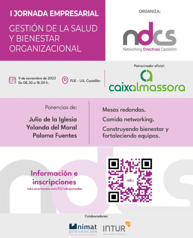 La Asociación Networking Directivas y Empresarias de Castellón anuncia la celebración de la primera Jornada Empresarial en Castellón, con la temática "Gestión de la Salud y Bienestar Organizacional". El evento, que reunirá a destacados expertos y profesionales del sector, se llevará a cabo el 9 de noviembre en la Fundación Universitat Jaume I (FUE UJI).