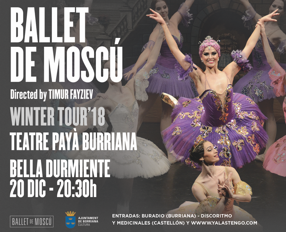 El Teatro Payà de Borriana se vestirá con sus mejores galas para recibir al Ballet de Moscú el próximo jueves día 20 de diciembre, a las 20.30 h. Una oportunidad única para ver danza de primer nivel en la localidad de La Plana. En esta ocasión será la obra 'La bella durmiente' la que representará la compañía rusa, dirigida por Timur Fayziev. Este ballet con música de Piotr Ilich Tchaikovsky y coreografía de Marius Petipa es uno de los más destacados del repertorio de ballets clásicos y habitual de las mejores compañías.