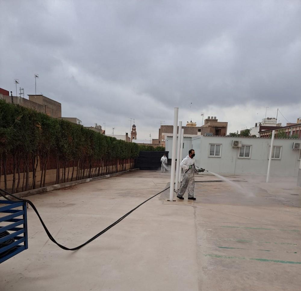 La Brigada Municipal de Obras y Servicios del Ayuntamiento de Almenara continua con su programa de desinfecciones en la localidad. Además de las zonas más concurridas del núcleo urbano y de la Playa Casablanca también ha procedido a la desinfección de los patios del CEIP Juan Carlos I de la localidad, actividad que se realizó el pasado viernes una vez los escolares ya no estaban en el centro.