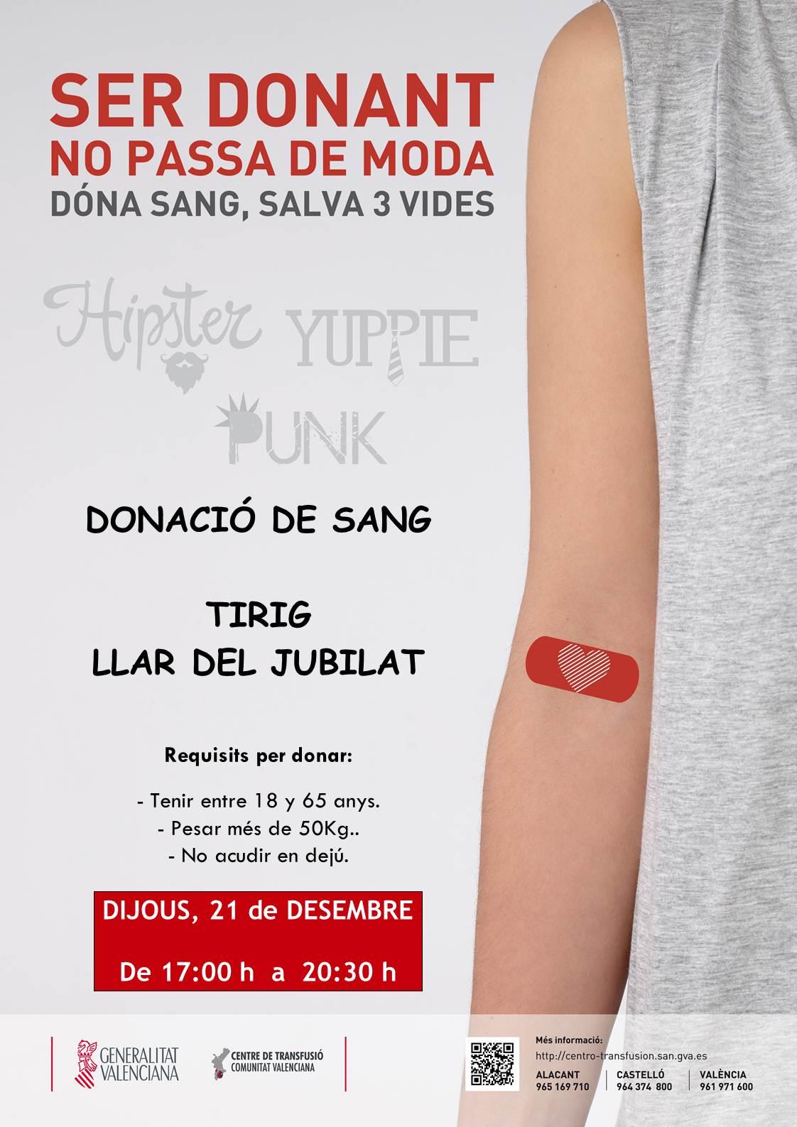 'Ser donant no passa de moda. Dóna sang salva tres vides'. Es el lema de la campaña de donación de sangre, impulsada por el Centro de Transfusiones de la Comunitat Valenciana, que llegará a Tírig el próximo jueves 21 de diciembre de 17.00 horas a 20.30 horas.