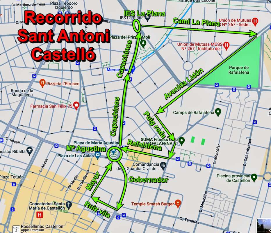 La Procesión de Sant Antoni saldrá del IES La Plana, recorrerá: Rosa Mª Molás, Camí de la Plana, Avenida Lidón, Puig Roda, Benicarló, Rafalafena, Mª Agustina, Gobernador, Ruiz Vila, Mayor, Mª Agustina, Capuchinos, Rosa Mª Molás hasta el IEs la Plana.