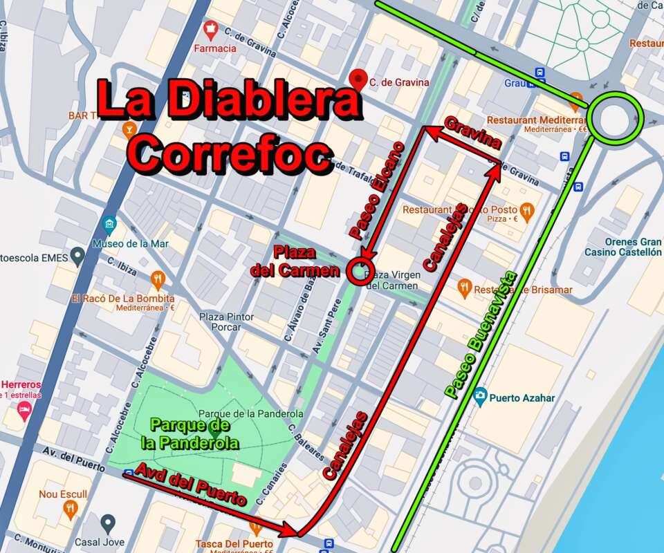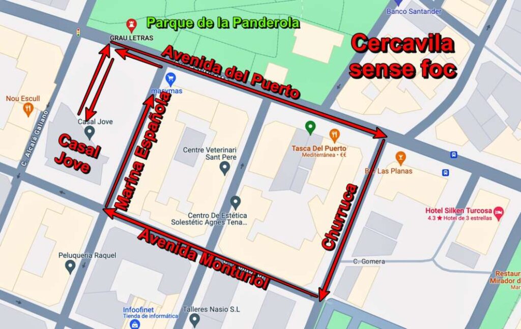 18:30- 19:00 horas: Cercavila sense foc. Itinerario: Casal Jove, Avenida del Puerto, calle Churruca, calle Monturiol, calle Marina Española, avenida del Puerto y Casal Jove.