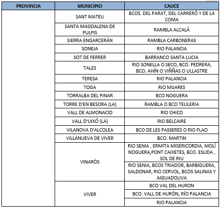 En las siguientes tablas, se listan las actuaciones otorgadas, desglosada por provincia, municipio, y el cauce afectado.